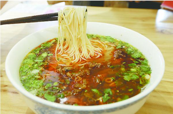 馬家大爺牛肉面秉承了懷慶府清化蘇寨村陳家小車?yán)蠝H饷娴淖龇ǎ⒅赜脺。清清亮亮的湯里,白蘿卜、香菜、蒜苗,再放些炸好的辣椒,標(biāo)準(zhǔn)的一清二白三綠四紅五黃。