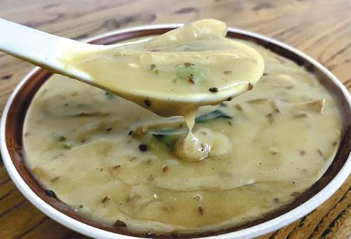 記者在現(xiàn)場看到,剛做好的豆沫呈半透明的乳黃色,里面有芝麻、青菜、花生、黃豆、粉條等,色彩豐富,賞心悅目;用鼻子一聞,醇厚的小米香,伴著豆香、芝麻香、花生香和蔬菜的清香融為一體,香味濃郁。記者忍不住喝了一口,糊濃稠細膩,配菜香脆嫩滑,咸淡適中,回味綿長,仿佛飲一壺醉人的美酒,滿嘴留香,讓人回味無窮。
