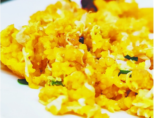 色澤金黃、鮮香可口的窩窩頭炒雞蛋。 記者 陳東明 攝