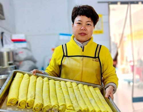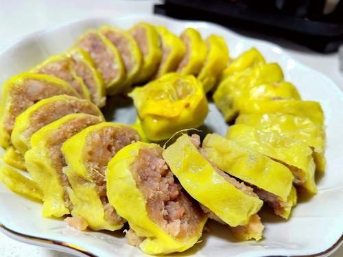 值得注意的是,這道美食用的豬肉全是新鮮的,從不用凍豬肉。還有淀粉的量也有標準,放多了不好吃,放少了不成團。雞蛋皮是用雞蛋和玉米淀粉和成漿做成的,在平底鍋上一攤一搖,一張薄如蟬翼的雞蛋皮就完成了。周紅衛(wèi)說,一天可以做二三百張雞蛋皮,然后用刀將其切成兩半。半張皮能包近300克肉,可以說皮薄肉多。