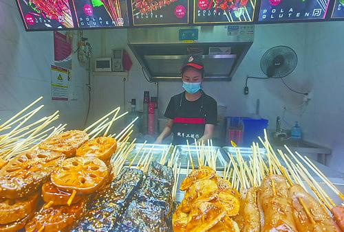 “初夏的晚上天氣涼爽,約朋友出來吃點夜宵,再在夜市散散步、逛逛街,感受熱鬧的煙火氣,很舒心!5月7日晚,走進錦祥商業(yè)街,各種美食攤位已經一字排開,市民李女士和朋友穿梭在人潮中,品嘗著炸串、烤魷魚、水果撈等各色美食。