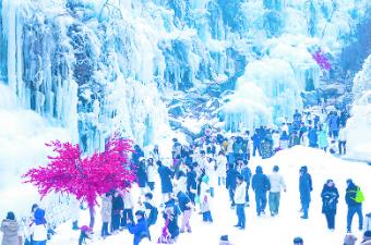 云臺(tái)山冰雪世界,千里冰封,萬里雪飄,千米冰瀑群驚艷綻放,傾瀉而下,落差50余米,綿延千米。