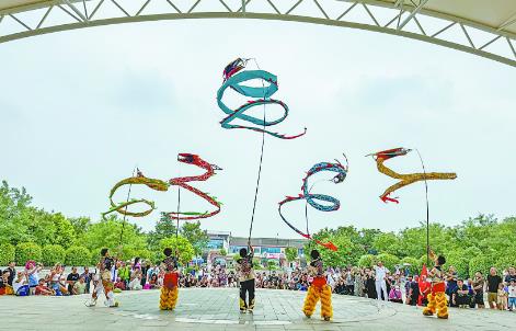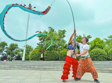 在西陶文化體育公園,外國(guó)友人觀看了長(zhǎng)拳、長(zhǎng)槍、太極拳等表演。特別是太極拳表演,表演者動(dòng)作剛?cè)岵?jì)、行云流水,飄逸的身姿讓外國(guó)友人豎起大拇指。隨后,市級(jí)非遺黃河龍獅代表性傳承人楊飛龍向外國(guó)友人傳授“黃河飛龍”技藝,大家躍躍欲試,舞動(dòng)手中的飛龍!包S河飛龍”技藝以黃河龍文化為表現(xiàn)特征,在動(dòng)作編排上以傳統(tǒng)舞龍技藝為基礎(chǔ),創(chuàng)新性地加入太極拳等武術(shù)動(dòng)作,生動(dòng)呈現(xiàn)了中華龍的神韻。