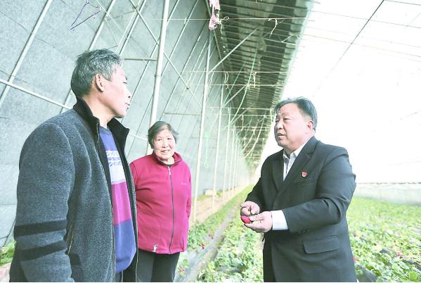 湯長軍(右)在溫室大棚查看草莓長勢。