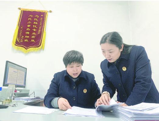 王萍(右)和同事溝通公證業(yè)務(wù)。
