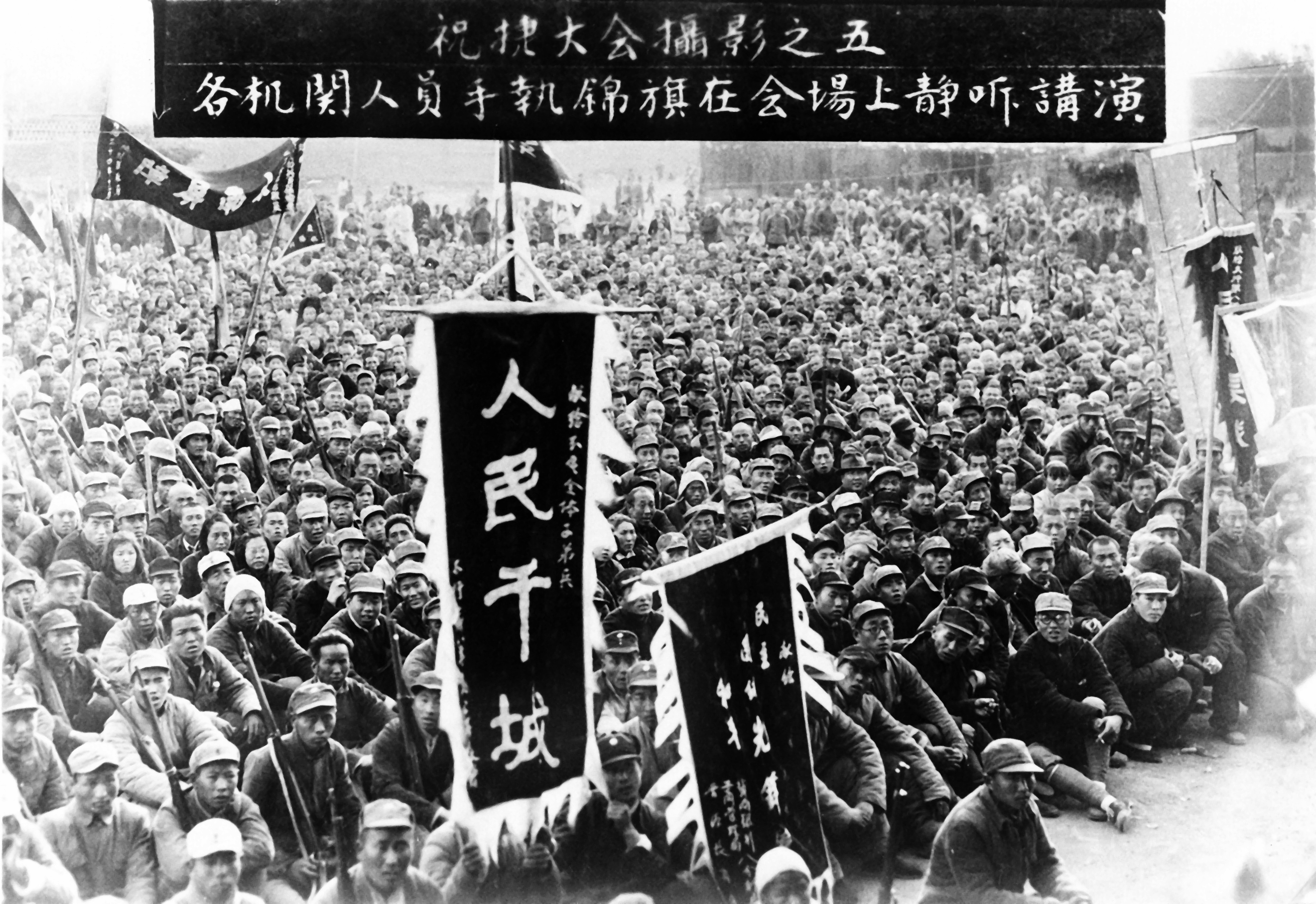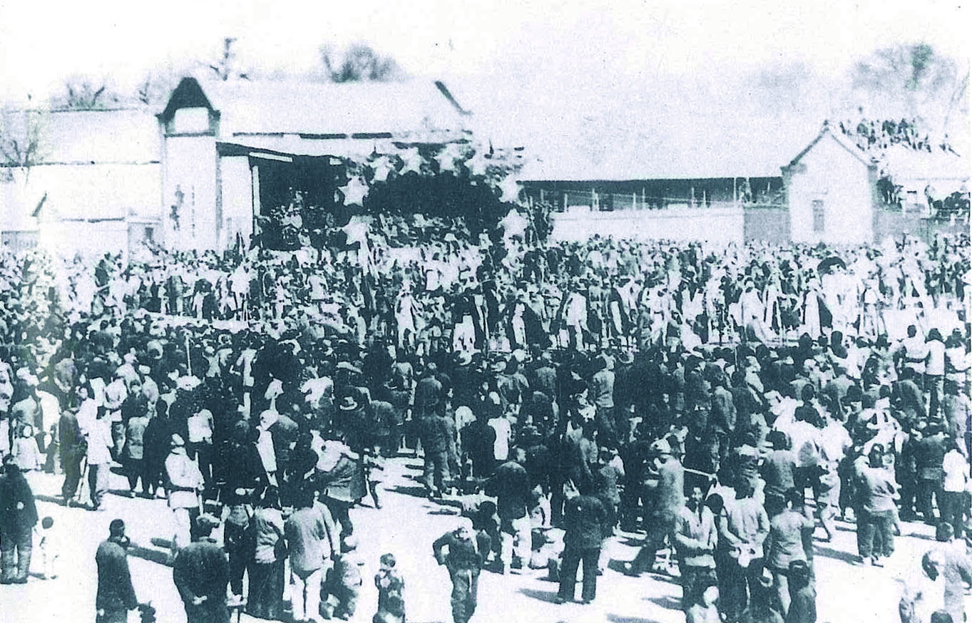 1945年9月抗日戰(zhàn)爭(zhēng)勝利后,我軍民在焦作廣場(chǎng)(今焦作貿(mào)易大廈處)召開萬(wàn)人祝捷大會(huì)。