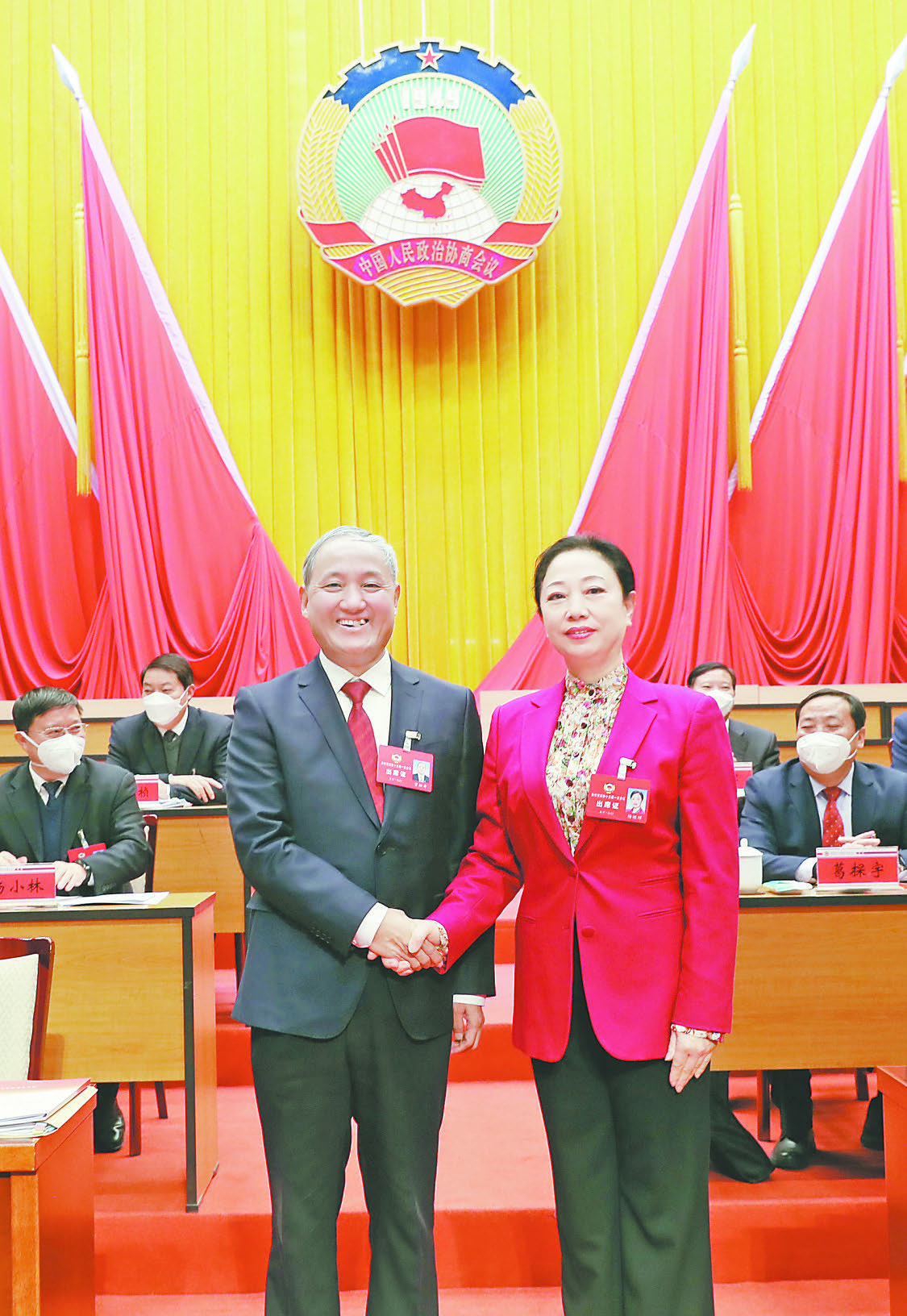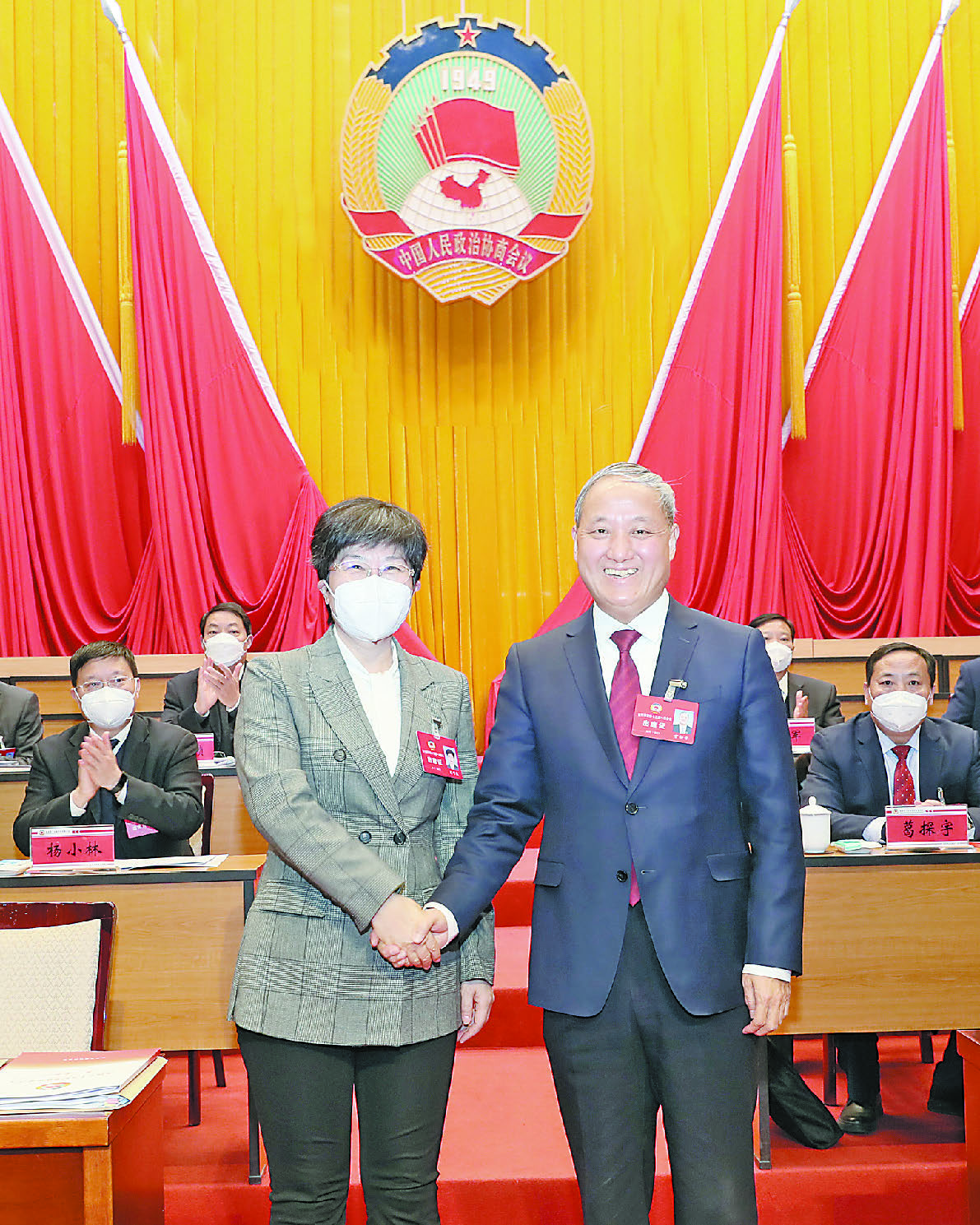 市委書記葛巧紅與新當(dāng)選的政協(xié)第十五屆焦作市委員會(huì)主席宮松奇握手表示祝賀。