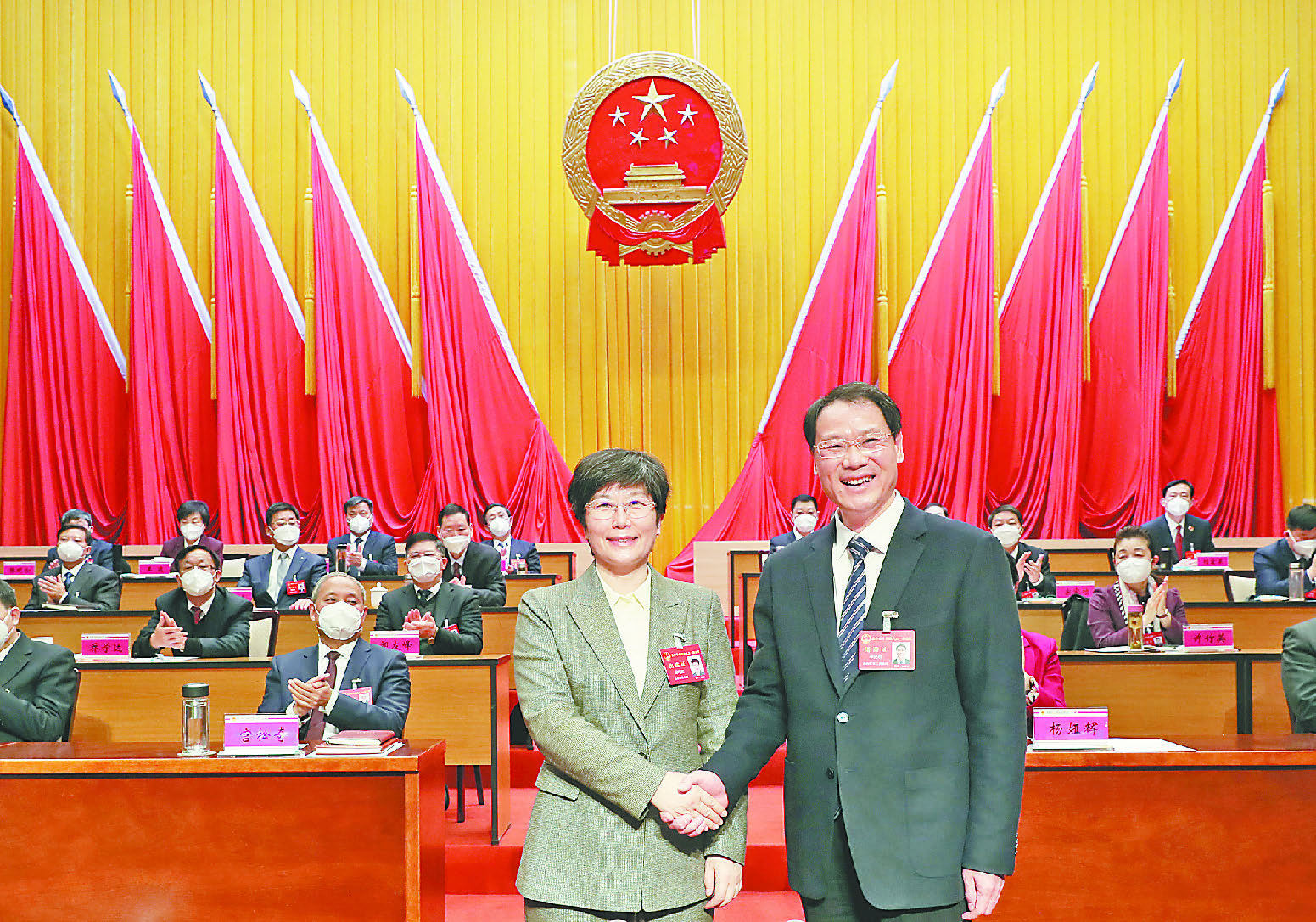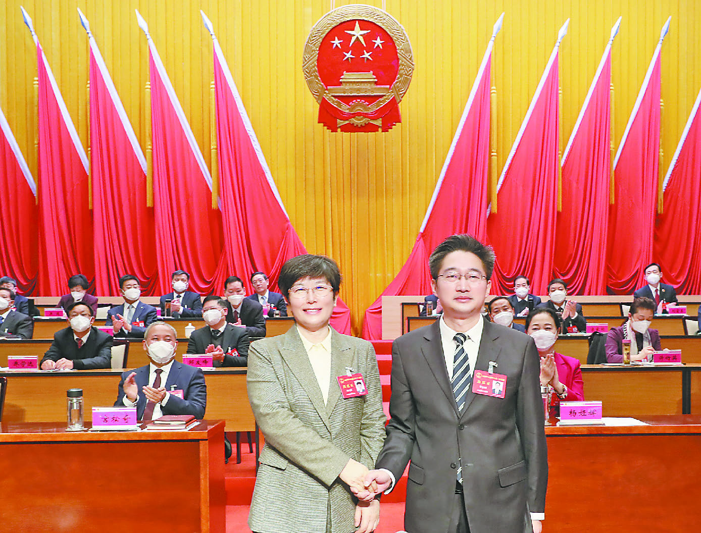 市委書記葛巧紅與新當(dāng)選的焦作市人民政府市長(zhǎng)李亦博握手表示祝賀。