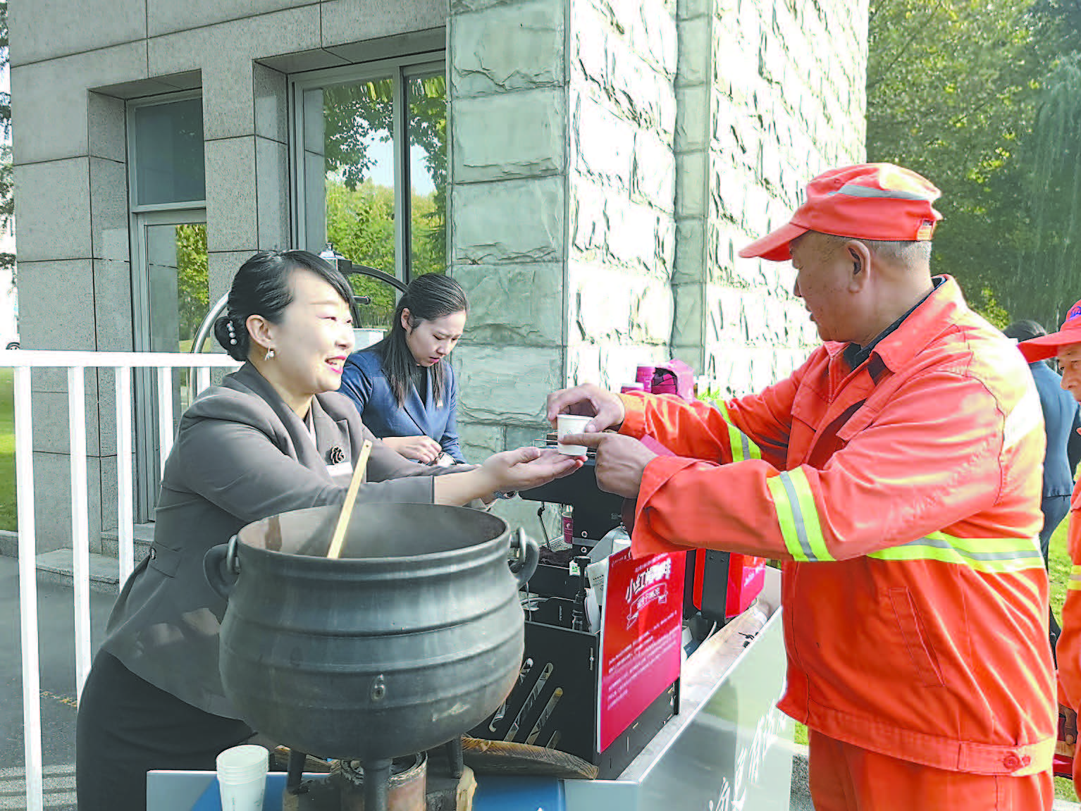 上圖 焦作迎賓館工作人員將做好的懷姜拿鐵咖啡遞給環(huán)衛(wèi)工人。