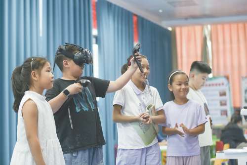 圖③ 孩子們沉浸式體驗市圖書館的數(shù)字化裝備。