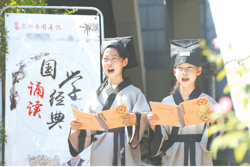圖④ “小書蟲”在參加市圖書館的經(jīng)典誦讀活動。