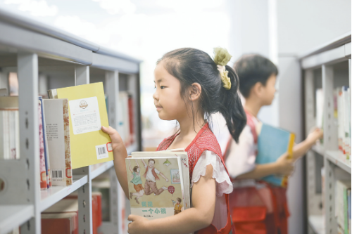 圖⑤ 市圖書館的小志愿者幫助管理員規(guī)整書籍。