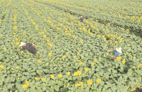昨日,在溫縣黃河街道下石井村,農(nóng)民在油葵田間勞作(無(wú)人機(jī)照片)。立秋至,各地農(nóng)民搶抓農(nóng)時(shí),開(kāi)展農(nóng)事活動(dòng)。