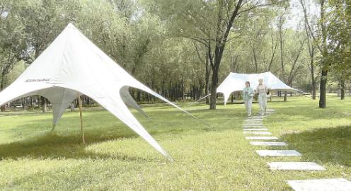 為滿足廣大市民對戶外休閑、運動健身、親近自然的需求,市園林綠化中心在龍源湖公園主環(huán)路沿線設(shè)置兩處開放共享區(qū)域,并在開放共享區(qū)設(shè)置了直飲水、帳篷、木質(zhì)桌椅、石質(zhì)棋桌、秋千、垃圾箱等便民服務(wù)設(shè)施,市民可以在這里親近大自然,體驗慢節(jié)奏生活。圖為龍源湖公園的開放共享區(qū)內(nèi)搭建的帳篷。