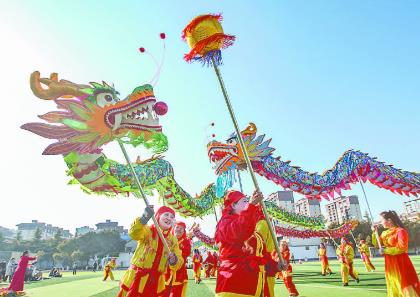 1月28日,博愛縣體育廣場,博愛空竹舞龍藝術(shù)團的成員在表演“金龍迎春”。當天,該藝術(shù)團在體育廣場上進行空竹、彩帶龍、長龍等不同藝術(shù)形式的表演,為觀眾們奉上一場視覺盛宴。