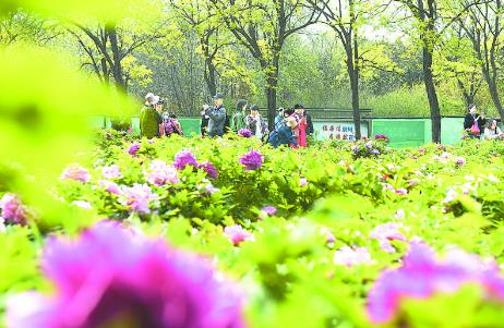 4月9日,市龍源湖公園里游客在觀賞牡丹花。4月正值牡丹花盛開的季節(jié),市龍源湖公園北廣場東西兩側的牡丹花花瓣層層疊疊,色澤鮮艷而濃郁,每一朵都宛如一位雍容華貴的仙子,在陽光下展現(xiàn)出迷人的風采。據該園相關工作人員介紹,該園的牡丹共有洛陽紅、卷葉紅、明星、霓虹幻彩等18個品種、1500余株。