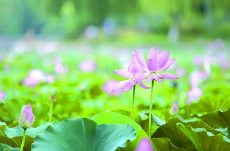 市龍?jiān)春珗@內(nèi)湖東南方向、市月季公園柏樹林北側(cè)、市翠綠湖北側(cè)、市縫山公園西湖內(nèi),荷花已處在盛開期,青荷蓋綠水,芙蓉披紅鮮,龍?jiān)绰泛诤拥暮苫ㄒ彩恰熬硎骈_合任天真”。