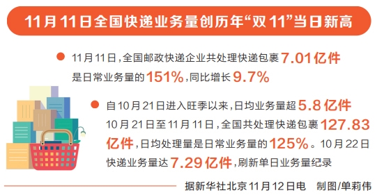 本報訊(記者 胡舒彤)11月12日,記者從省郵政管理局獲悉,11月11日,全省郵政快遞業(yè)攬收快遞包裹3346萬件,同比增長16.7%;投遞快遞包裹2757萬件,同比增長21.8%。