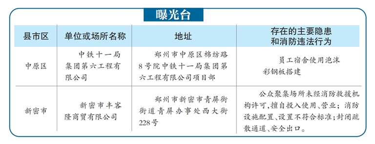 頂端新聞·河南商報訊(記者 劉遠懷)11月22日,鄭州市消防救援支隊公布了本月第二輪消防隱患和違法行為,兩家上榜單位分別是中鐵十一局集團第六工程有限公司和新密市豐客隆商貿(mào)有限公司。