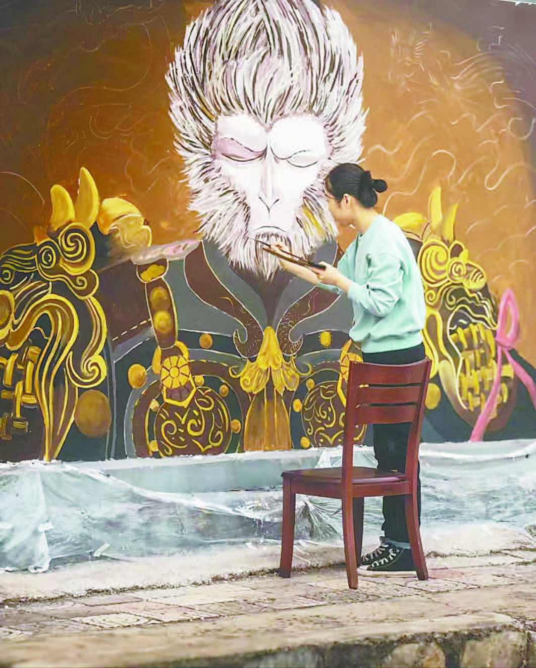 她身邊不遠(yuǎn)處是她和姐姐王貴在不久前畫的墻繪畫,有黑神話悟空、壯麗山水,還有卡通人物等。