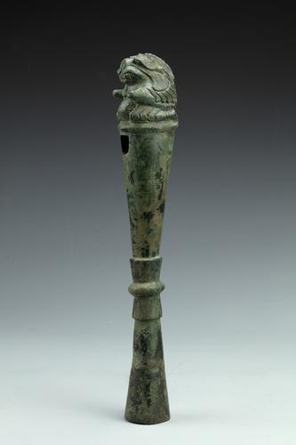 據(jù)市博物館工作人員介紹,這件西晉熨斗支架青銅質(zhì)地,殘高38.7厘米、底徑4.8厘米,于1989年出土于解放區(qū)王褚街道嘉禾屯林場,修復(fù)前殘斷為兩截、底座缺失,通體表面礦化。拂去泥土和銹跡后,熨斗支架頂部現(xiàn)出形似小熊造型。小動物前肢伸出向前,蹲坐于支架頂端,兩眼炯炯有神,模樣憨態(tài)可掬。