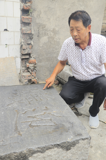 李隨群向記者介紹待王村東門出土的石碑。