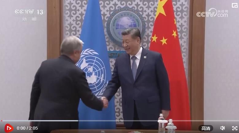 當(dāng)?shù)貢r間7月4日下午,國家主席習(xí)近平在阿斯塔納出席上海合作組織峰會期間會見聯(lián)合國秘書長古特雷斯。