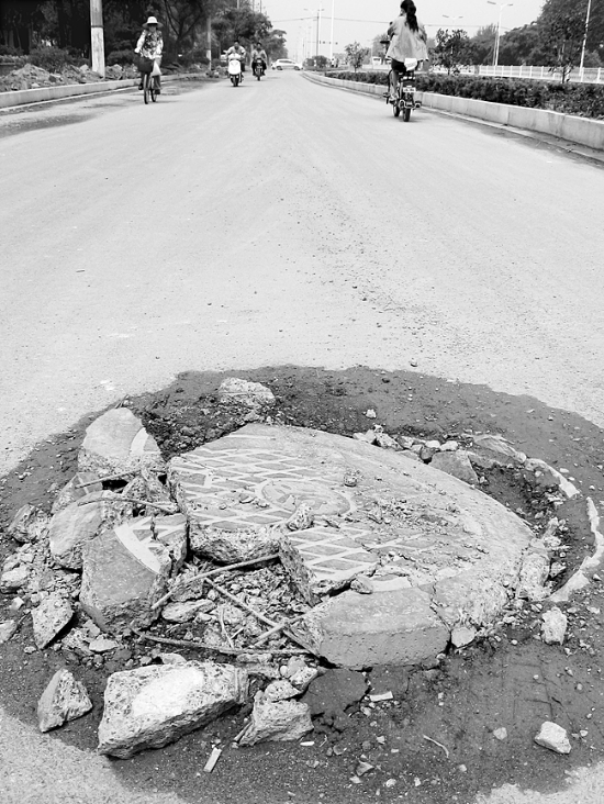 記者粗略統(tǒng)計了一下,僅市豐收路從某汽車銷售中心起至市金土地農(nóng)貿(mào)市場的700余米道路兩側(cè),就有60余個窨井出現(xiàn)了這種狀況。這些窨井蓋上印著“雨”、“污”、“市政”等字樣。個別窨井蓋已被碾碎,不少窨井周圍還碎落著一些混凝土塊。