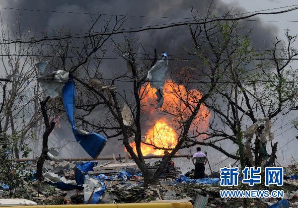7月28日,消防人員沖向爆炸中心火場。新華社記者孫參攝