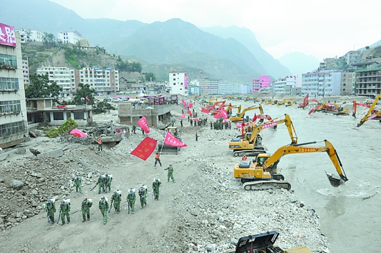 舟曲特大山洪泥石流災(zāi)害發(fā)生后,導(dǎo)致白龍江形成堰塞湖致使江水水位暴漲,舟曲縣城三分之一街區(qū)被淹。武警水電部隊(duì)、蘭州軍區(qū)工程兵某部每天出動(dòng)上千名官兵,大型機(jī)械百余臺,先是排除了堰塞湖潰決險(xiǎn)情,從13日轉(zhuǎn)入河道應(yīng)急疏通任務(wù),24小時(shí)持續(xù)奮戰(zhàn),終于完成這一艱巨任務(wù)。