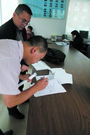 方玄昌在申請(qǐng)書(shū)上簽字。晨報(bào)記者 郝濤/攝