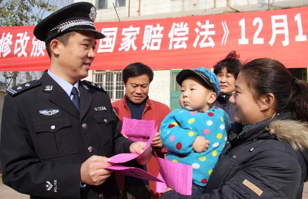 11月30日,山東棗莊市公安局市中分局民警在廣濟(jì)路向市民宣傳新修改的《中華人民共和國(guó)國(guó)家賠償法》。新修改的《中華人民共和國(guó)國(guó)家賠償法》12月1日起正式實(shí)施。2010年4月29日,十一屆全國(guó)人大常委會(huì)第十四次會(huì)議通過(guò)了共27條的關(guān)于修改國(guó)家賠償法的決定! ⌒氯A社發(fā)(孫中喆 攝)