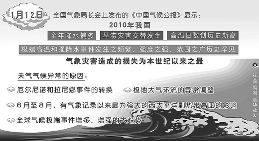 1月12日,中國(guó)氣象局發(fā)布《2010年中國(guó)氣候公報(bào)》。公報(bào)顯示,2010年我國(guó)極端高溫和強(qiáng)降水事件發(fā)生之頻繁、強(qiáng)度之強(qiáng)、范圍之廣歷史罕見,是本世紀(jì)以來我國(guó)氣候最異常的一年。