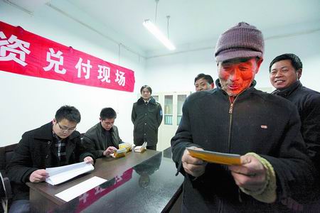 資料圖片:領(lǐng)到拖欠工錢(qián)的農(nóng)民工笑了。