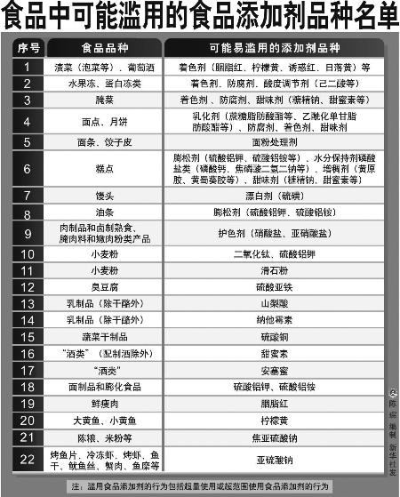 但目前在中國(guó),添加劑被濫用的現(xiàn)象極其嚴(yán)重。4月23日,國(guó)務(wù)院食品安全委員會(huì)辦公室公布已發(fā)現(xiàn)的151種食品和飼料中非法添加物質(zhì)名單,其中包括47種可能在食物中“違法添加的非食用物質(zhì)”、22種“易濫用食品添加劑”。