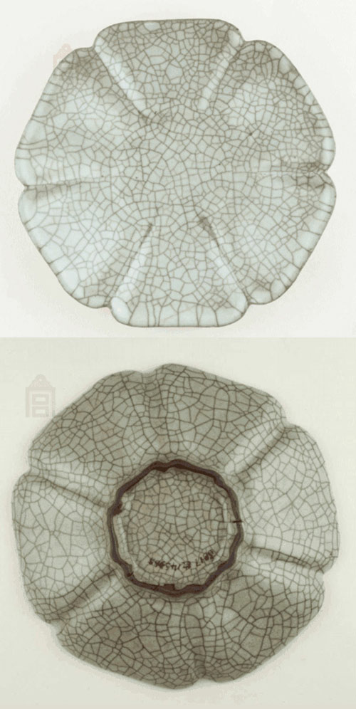 昨天,央視《共同關(guān)注》節(jié)目中播放了其拍攝到的破碎文物圖片。從圖片中可以看到,文物破碎成了幾片,情況較為嚴(yán)重。故宮方面則表示,文物依然有希望修復(fù)。但有細(xì)心網(wǎng)友表示,在故宮的官網(wǎng)上,哥窯青釉葵瓣口盤(pán)呈六瓣葵花式,淺腹,坦底。腹壁向里凸出6道棱線(xiàn),圈足亦隨腹壁起伏變化。通體施青灰色釉,釉面開(kāi)細(xì)碎片紋。圈足露胎處呈黑褐色(圖1)。而在央視公布的正視圖和背視圖中,并沒(méi)有出現(xiàn)腹壁向里凸出的6道棱線(xiàn),而且圈足是圓的,也不是像資料照片中隨腹壁起伏變化,最為重要的是圈足露胎處沒(méi)有呈現(xiàn)黑褐色(圖2)。更細(xì)心的網(wǎng)友還比較了兩件瓷器背后的故宮檔案編號(hào)。