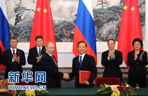 10月11日,中國國務(wù)院總理溫家寶同俄羅斯總理普京在北京人民大會堂舉行會晤后共同出席有關(guān)合作文件的簽字儀式。這是溫家寶和普京在簽字儀式上握手。新華社記者 饒愛民 攝[組圖]