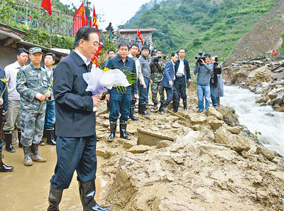10月5日,溫家寶緩步走到淹沒田頭小學的滑坡體前,向遇難的孩子和村民獻上一束菊花。