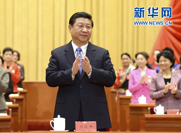 2013年10月28日,中國婦女第十一次全國代表大會(huì)在北京人民大會(huì)堂開幕。中共中央總書記、國家主席、中央軍委主席習(xí)近平在主席臺(tái)向與會(huì)代表鼓掌致意。新華社記者 馬占成 攝