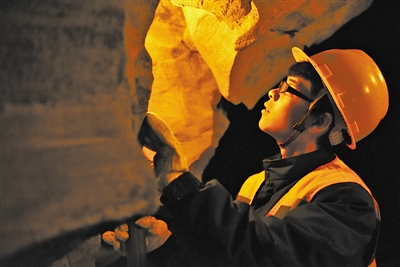 貴州貴陽工務(wù)段烏江橋路檢查工區(qū)工人在檢查溶洞巖石發(fā)育情況。 |