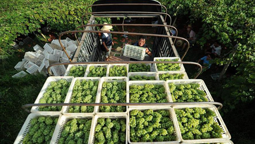收購商在貴州省玉屏縣新店生態(tài)葡萄現(xiàn)代農(nóng)業(yè)園區(qū)收購水晶葡萄(2018年7月30日攝)。