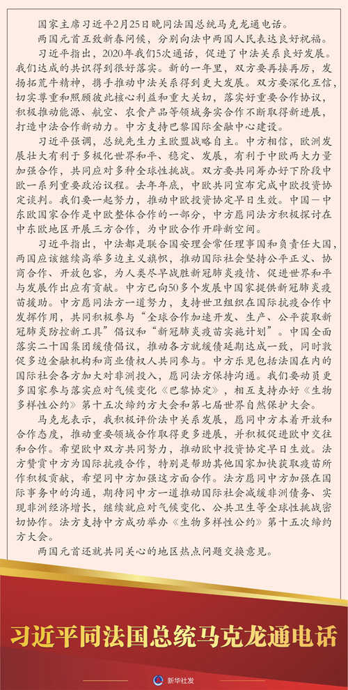 國家主席習近平2月25日晚同法國總統(tǒng)馬克龍通電話。