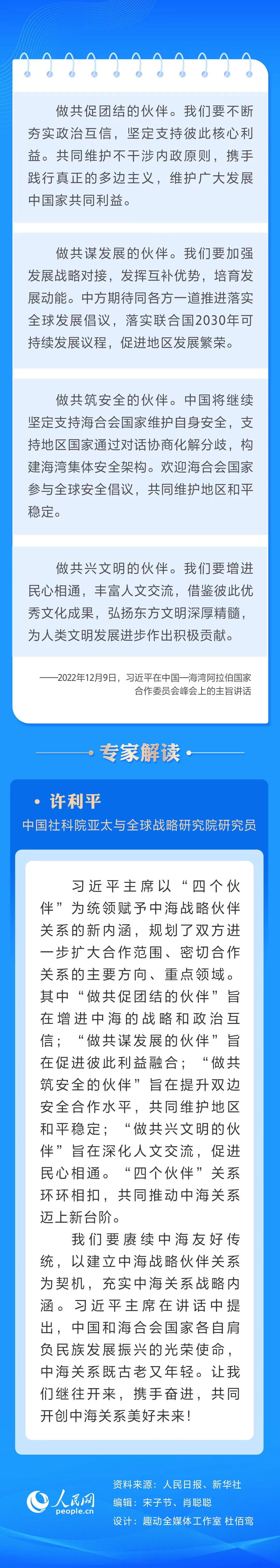當(dāng)?shù)貢r(shí)間12月9日下午,首屆中國—海灣阿拉伯國家合作委員會(huì)峰會(huì)在利雅得阿卜杜勒阿齊茲國王國際會(huì)議中心舉行。國家主席習(xí)近平出席峰會(huì)并發(fā)表題為《繼往開來,攜手奮進(jìn) 共同開創(chuàng)中海關(guān)系美好未來》的主旨講話。人民網(wǎng)梳理習(xí)近平主席圍繞中海戰(zhàn)略伙伴關(guān)系提出的四點(diǎn)主張并邀請(qǐng)專家解讀。