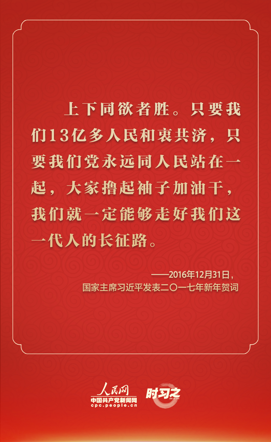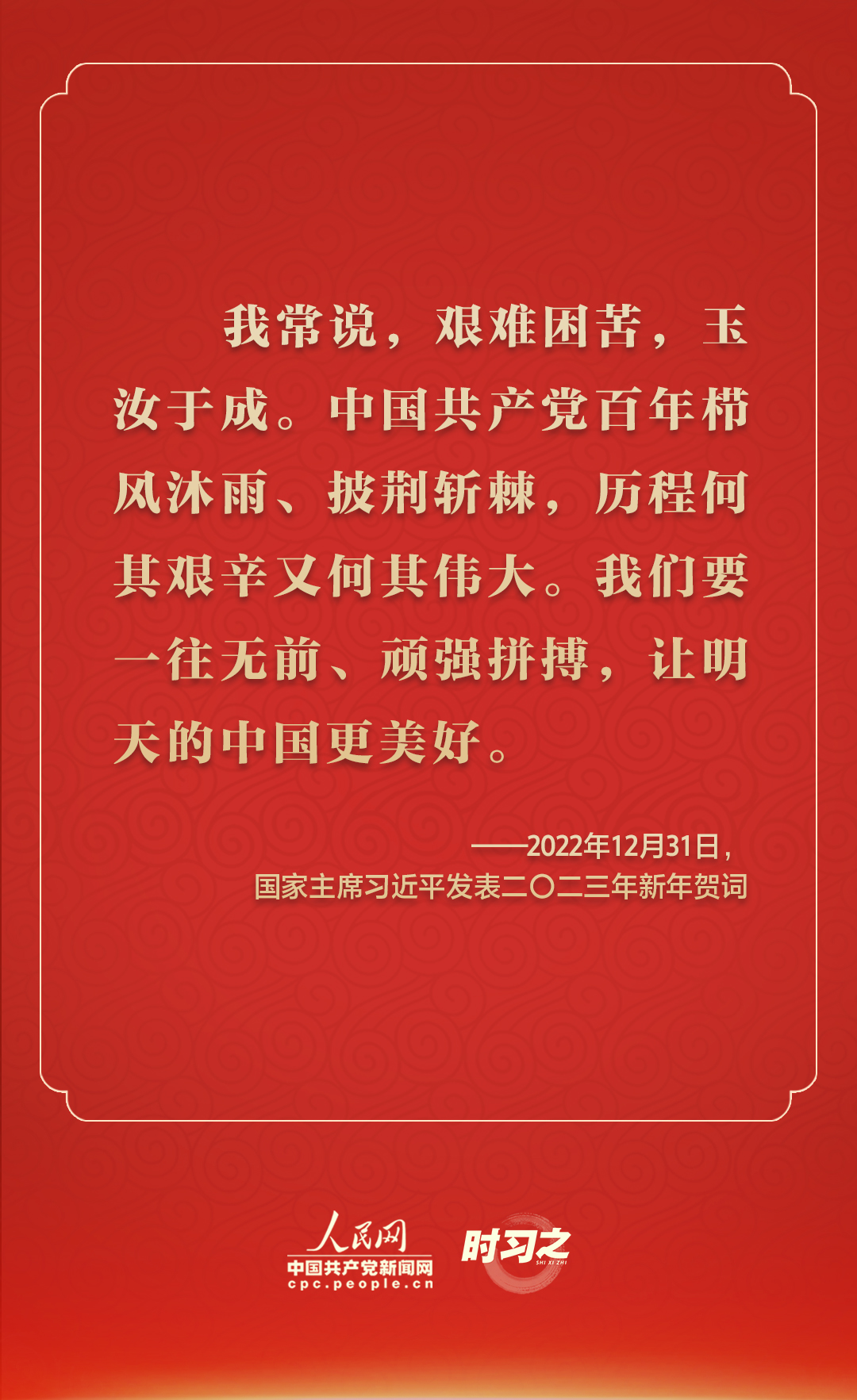 新年前夕,國(guó)家主席習(xí)近平通過中央廣播電視總臺(tái)和互聯(lián)網(wǎng),發(fā)表了二〇二三年新年賀詞。每一年的新年賀詞,習(xí)近平主席堅(jiān)定而溫暖的話語(yǔ)直抵人心,是對(duì)全黨全國(guó)各族人民在全面建設(shè)社會(huì)主義現(xiàn)代化國(guó)家新征程上勇毅前行的有力動(dòng)員。人民網(wǎng)·中國(guó)共產(chǎn)黨新聞網(wǎng)“時(shí)習(xí)之”欄目帶您一起從習(xí)近平主席的新年賀詞里汲取前行力量。