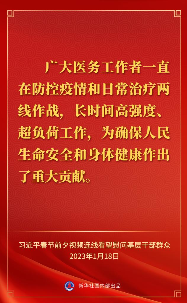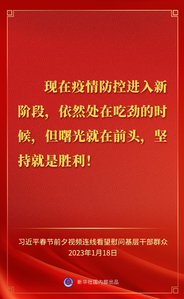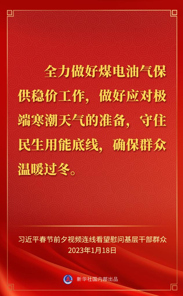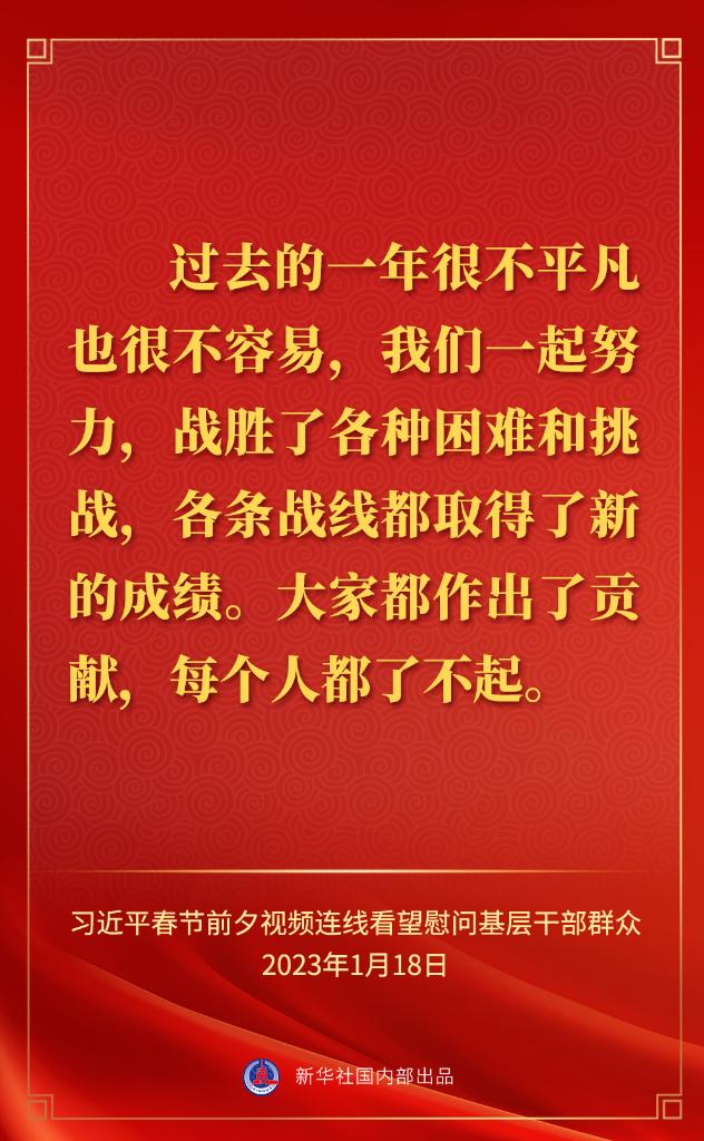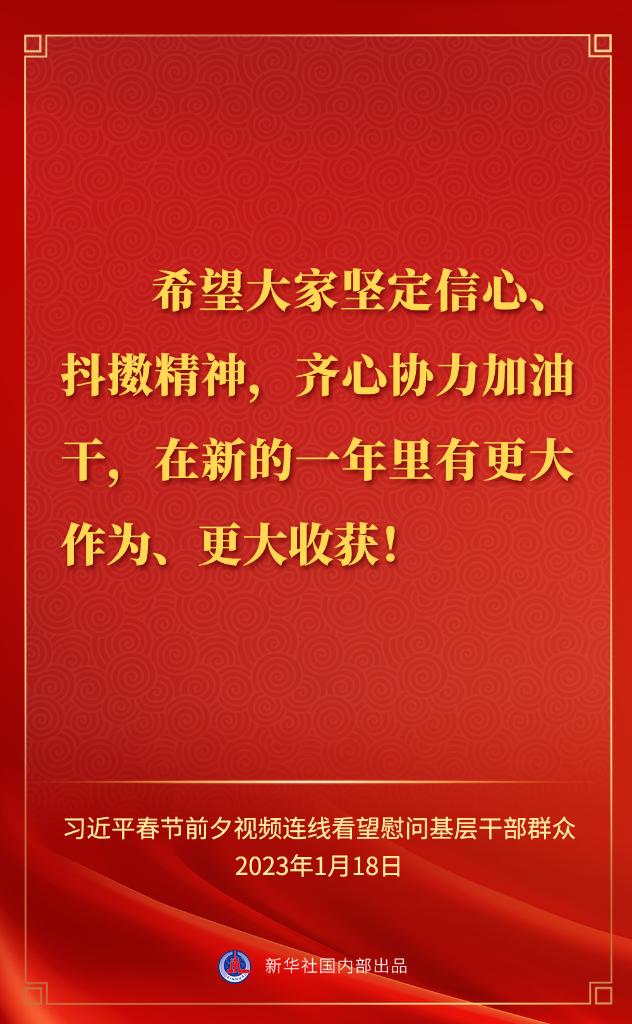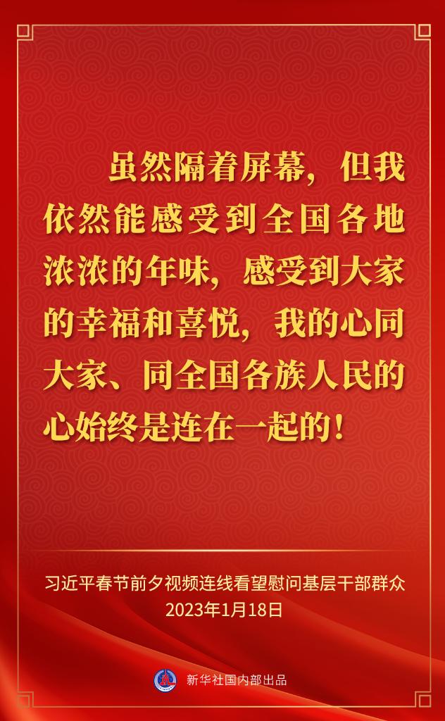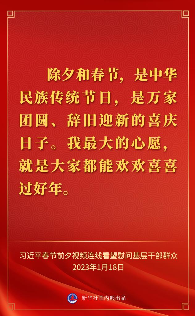 春節(jié)即將到來之際,中共中央總書記、國家主席、中央軍委主席習(xí)近平通過視頻連線看望慰問基層干部群眾,向全國各族人民致以新春的美好祝福,祝各族人民身體健康、闔家幸福、事業(yè)進(jìn)步、兔年吉祥!祝愿?jìng)ゴ笞鎳睒s昌盛、國泰民安!