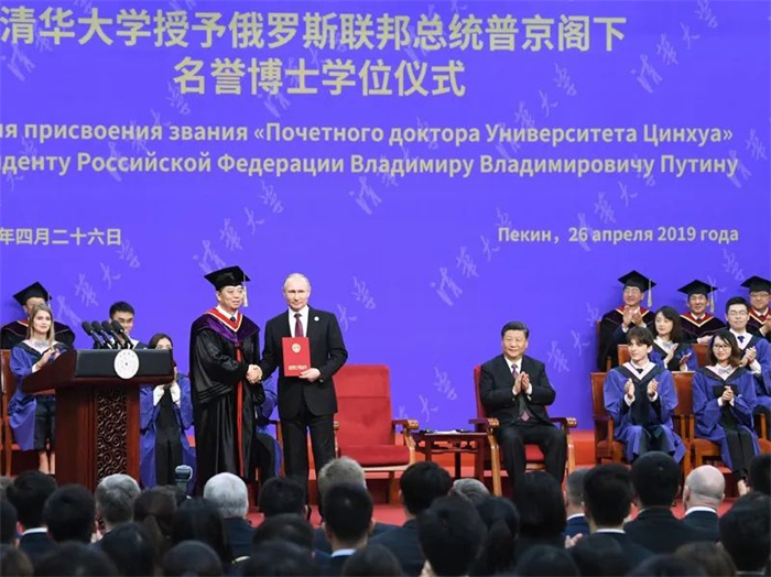 2019年4月26日,國(guó)家主席習(xí)近平在北京友誼賓館出席清華大學(xué)向俄羅斯總統(tǒng)普京授予名譽(yù)博士學(xué)位儀式。新華社記者 王曄 攝