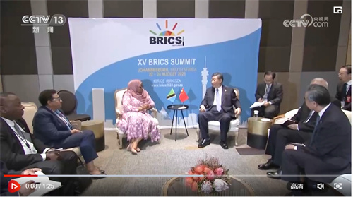 當(dāng)?shù)貢r(shí)間8月24日上午,國家主席習(xí)近平在約翰內(nèi)斯堡出席金磚國家領(lǐng)導(dǎo)人會(huì)晤期間會(huì)見坦桑尼亞總統(tǒng)哈桑。