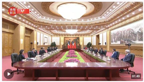 10月17日上午,國家主席習近平在人民大會堂同來華出席第三屆“一帶一路”國際合作高峰論壇并進行國事訪問的智利總統(tǒng)博里奇舉行會談。