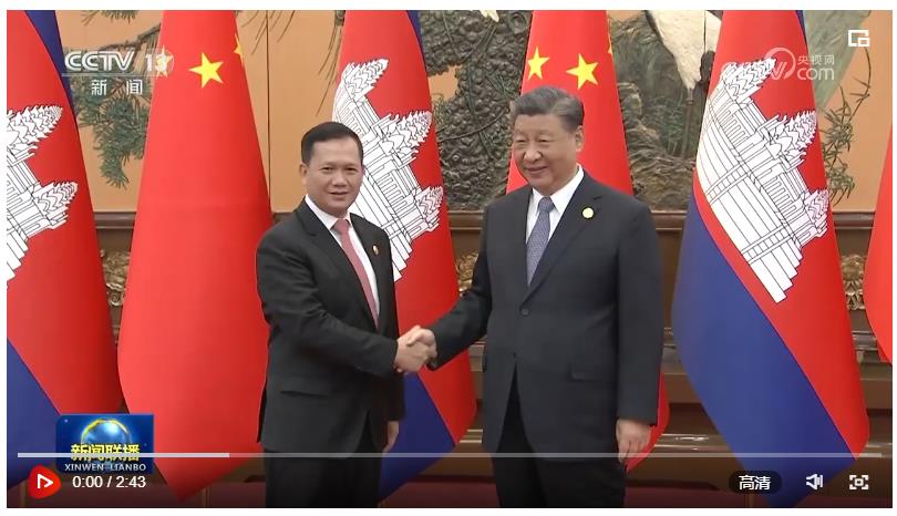 10月19日上午,國(guó)家主席習(xí)近平在人民大會(huì)堂會(huì)見(jiàn)來(lái)華出席第三屆“一帶一路”國(guó)際合作高峰論壇的柬埔寨首相洪瑪奈。