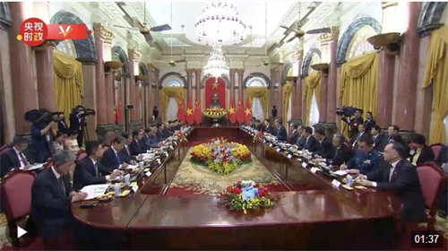 習近平指出,這是我擔任中共中央總書記、國家主席以來第三次對越南進行國事訪問,是對去年10月阮富仲總書記訪華的回訪,也是今年我對外訪問的收官之旅,充分表明中越關系在中國外交布局特別是周邊外交中的特殊地位。